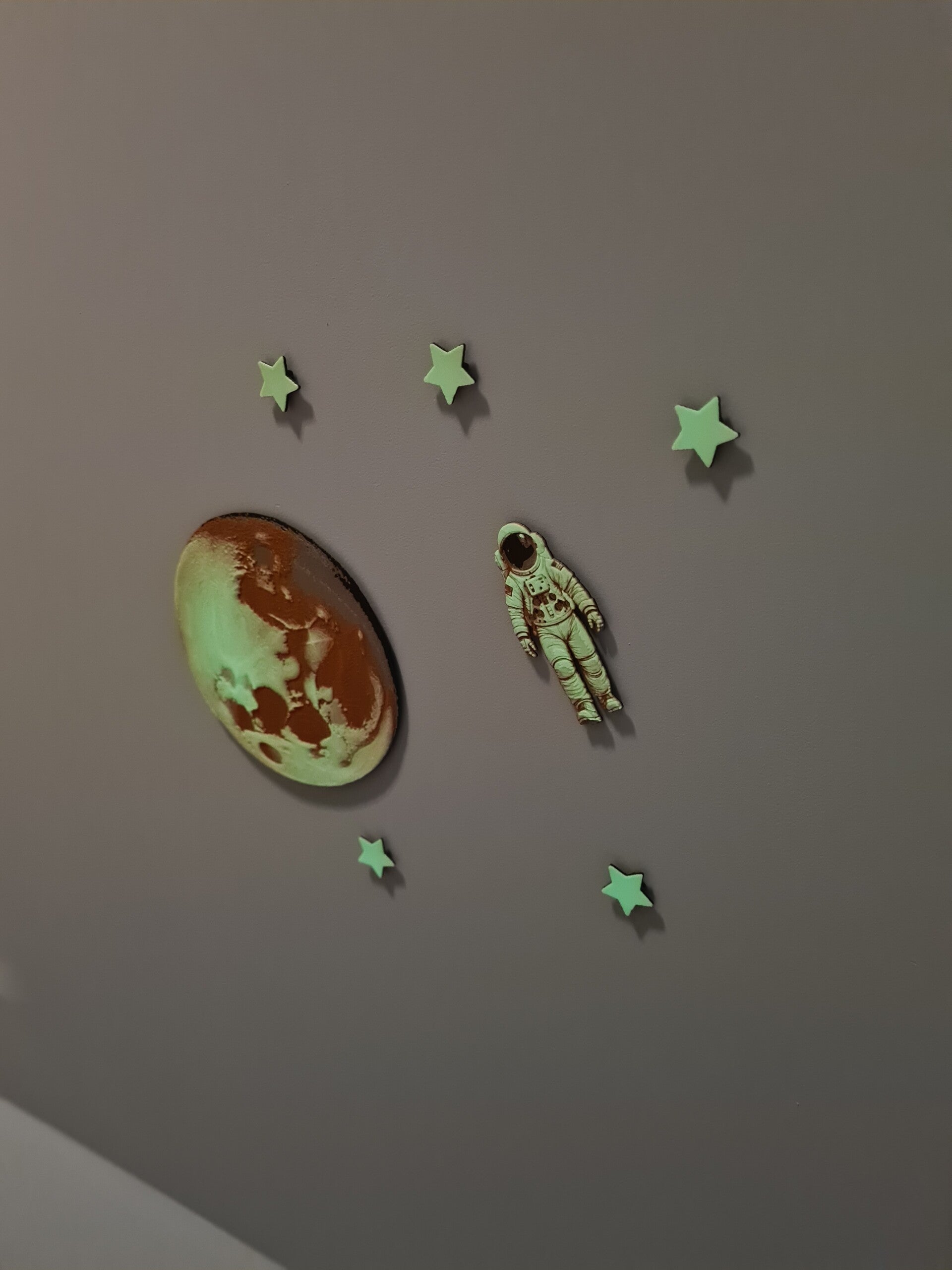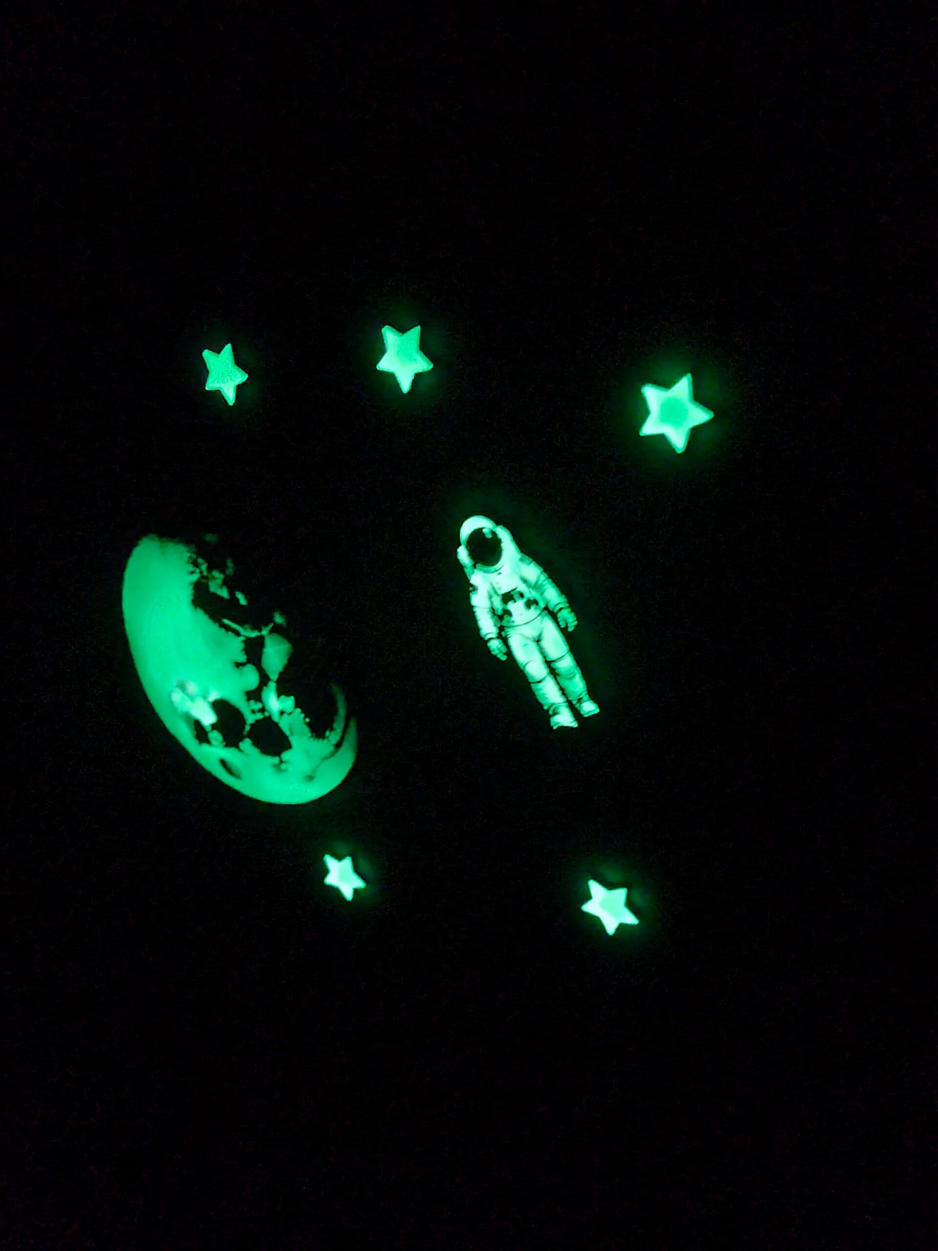 Extra leuk: deze decoraties zijn glow in the dark! Overdag laden ze op met licht, zodat ze 's nachts zacht oplichten — perfect om te dromen tussen de sterren.